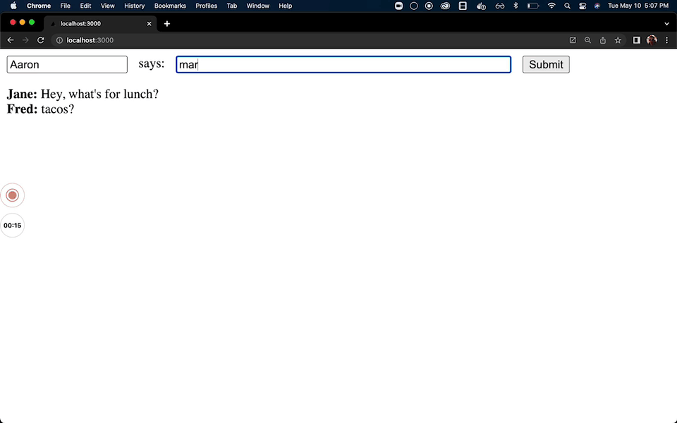 Now let's invoke the mutator when the user types a message. Replace the content of onSubmit so that it invokes the mutator: